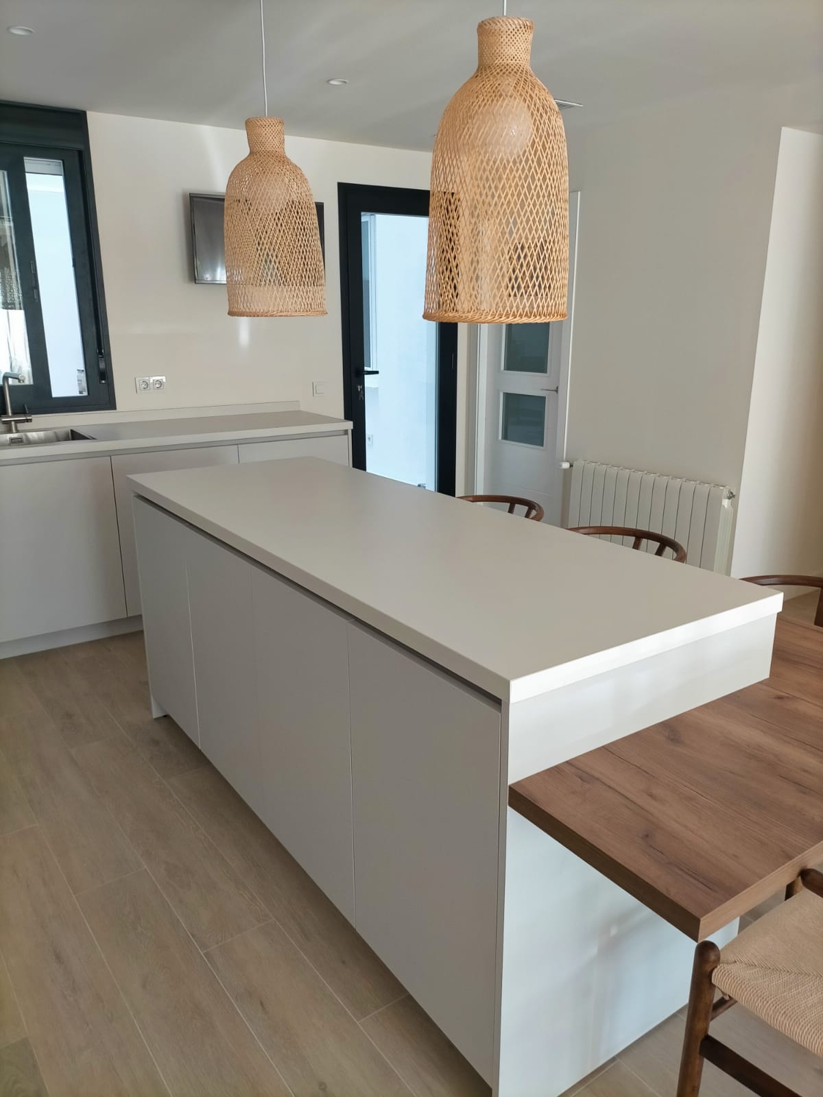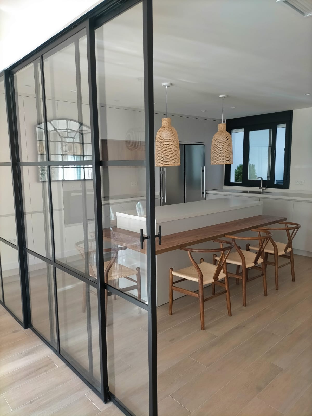 Uno de los grandes protagonistas del proyecto es la barra de madera natural, integrada a la isla como mesa de comedor. Una solución funcional que invita a compartir desayunos, comidas o cenas sin salir del espacio de cocina. El conjunto se completa con sillas de inspiración escandinava, luminarias en fibras naturales y un cerramiento acristalado que aporta amplitud y ligereza.