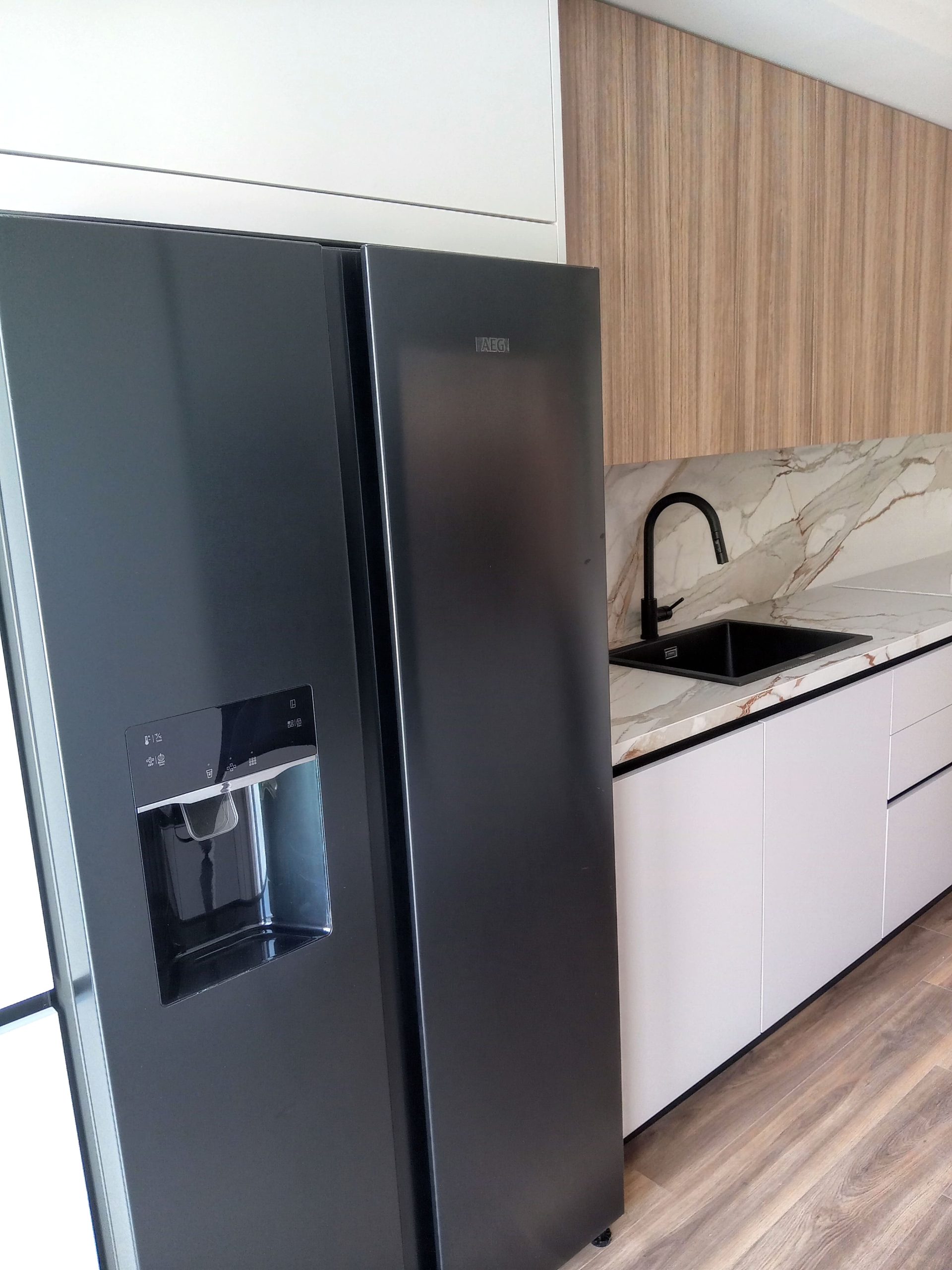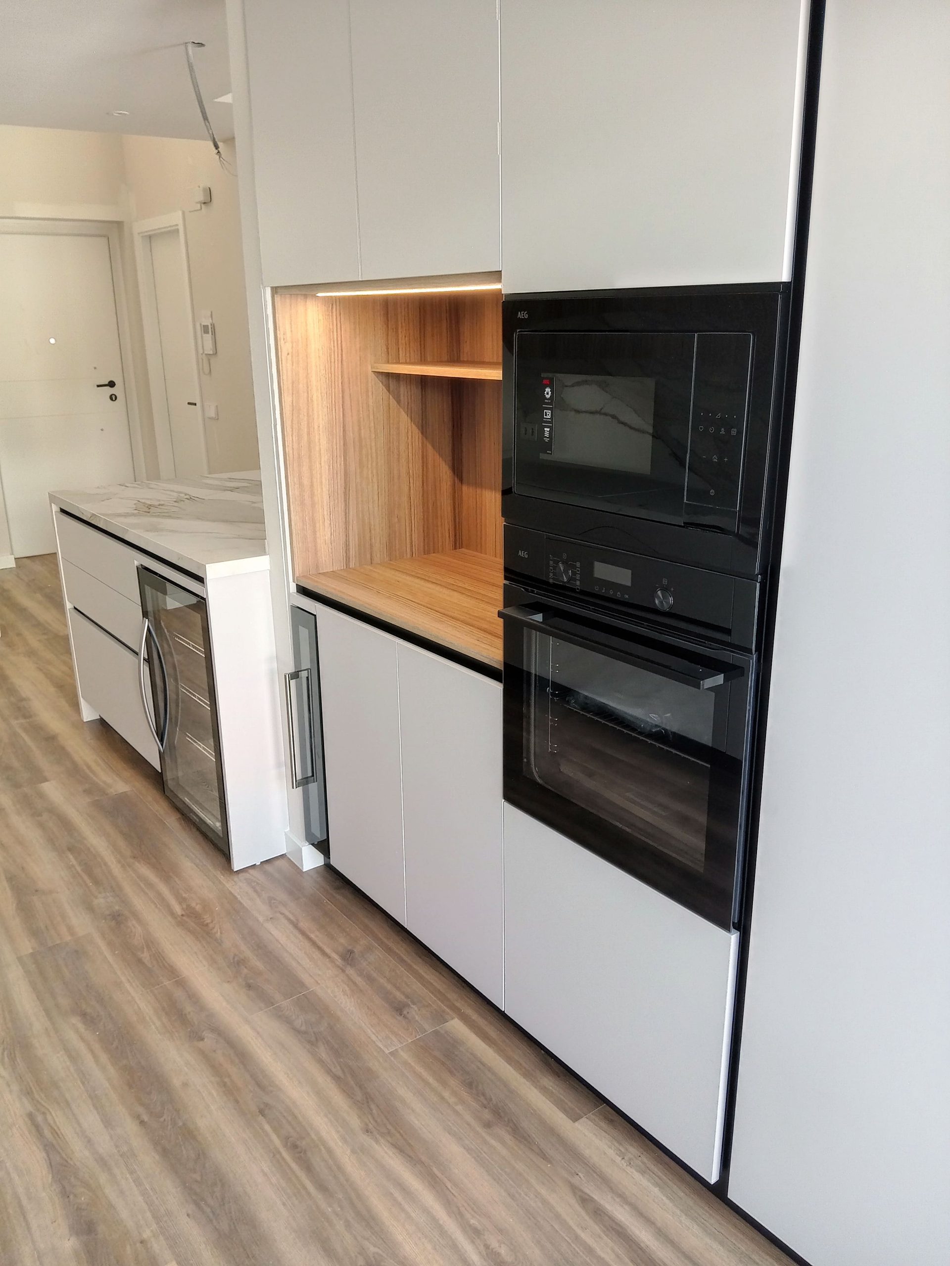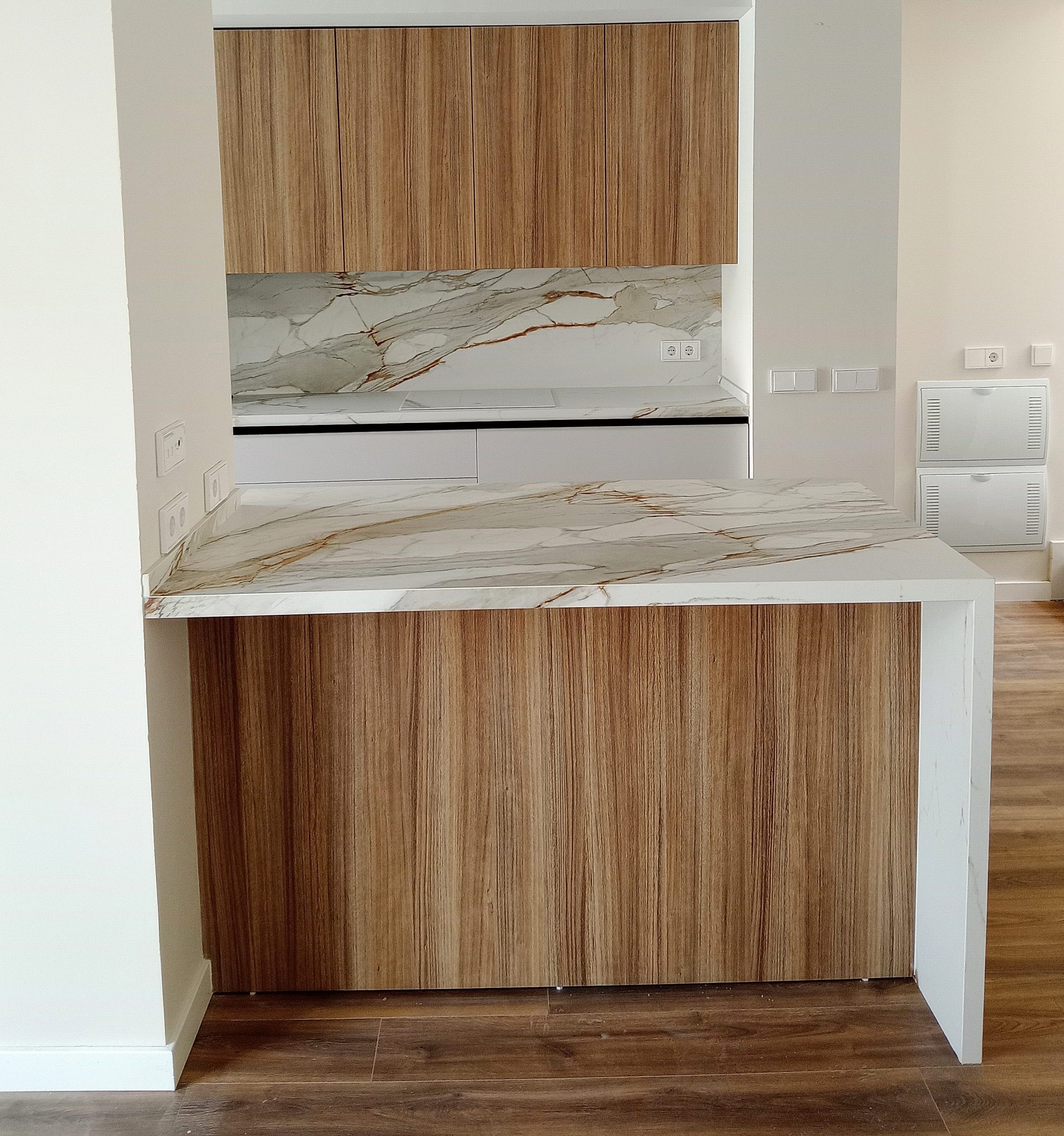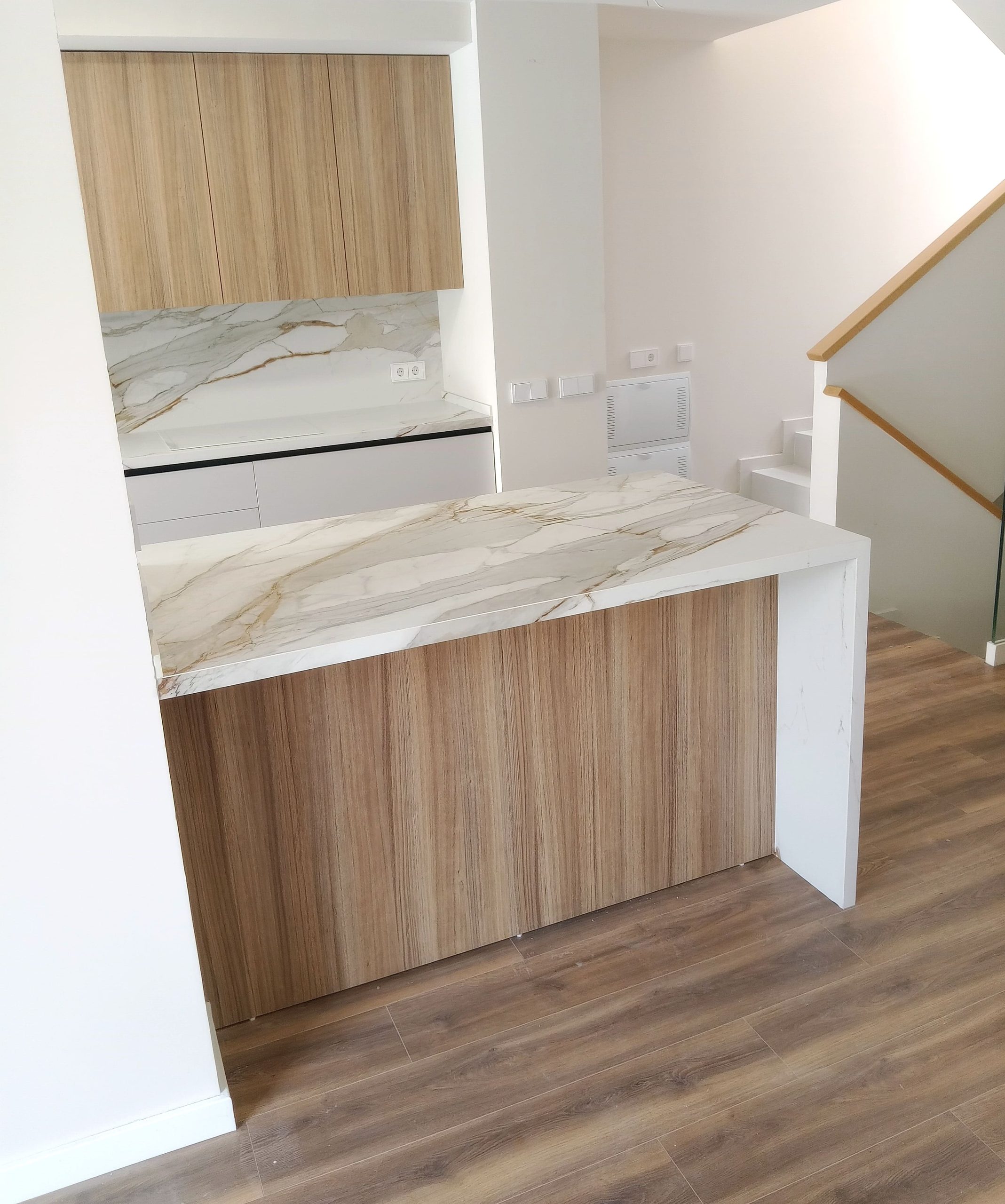 Combinación topo con madera y encimera porcelánica efecto marmoleado