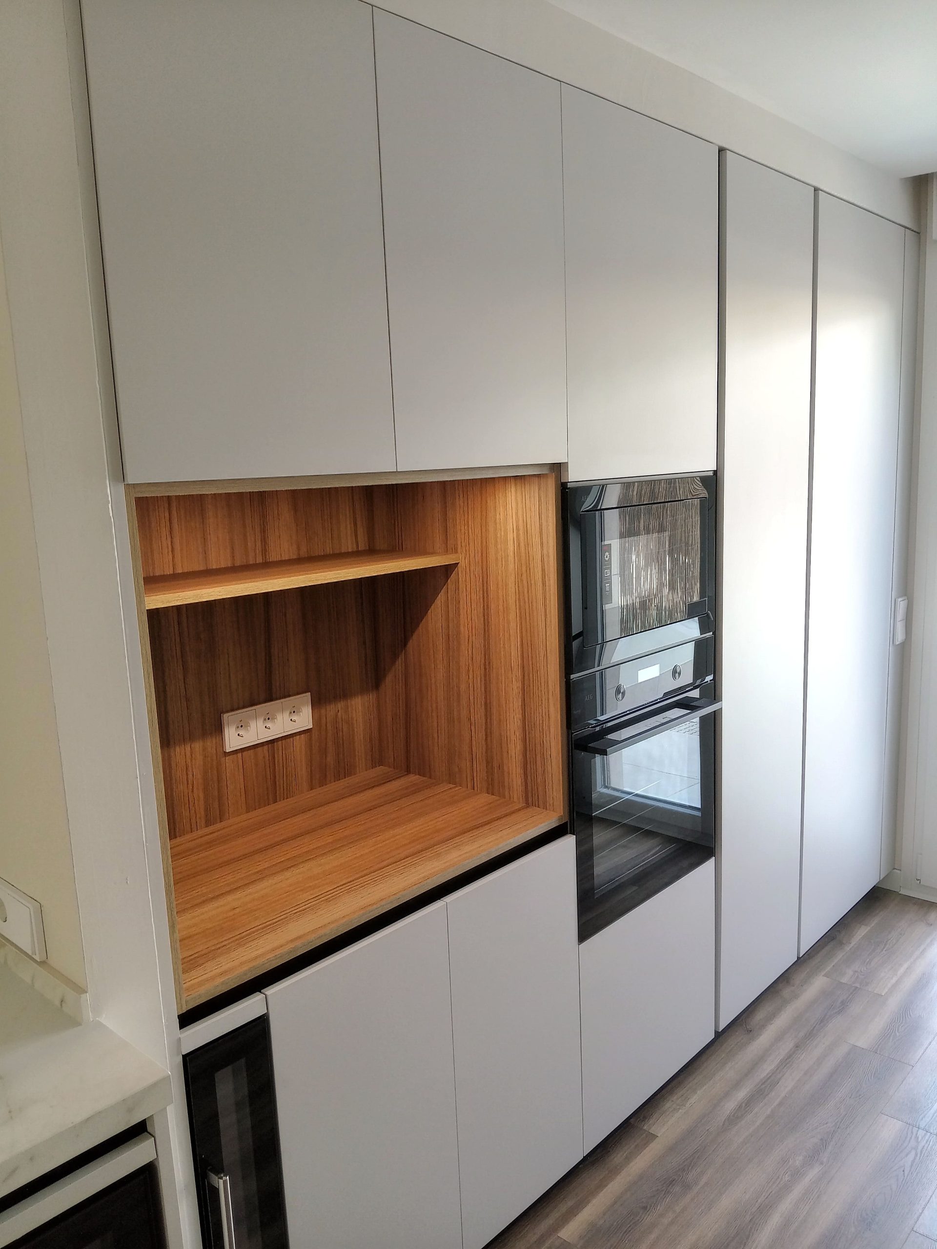 En esta cocina hemos creado un espacio abierto, práctico y elegante, ideal para quienes desean unir el diseño moderno con la calidez del hogar. La distribución en paralelo permite aprovechar al máximo la amplitud y la luz natural, conectando la zona de trabajo con un office acogedor junto a la península, perfecto para comidas rápidas o reuniones en familia.
