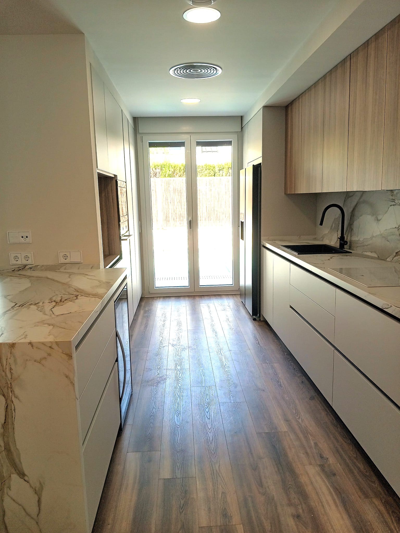 El equilibrio visual lo marca la combinación de frentes en acabado topo con armarios en madera natural, aportando serenidad y calidez al ambiente. La encimera porcelánica efecto mármol, con vetas en tonos beige y dorados, se prolonga también en el frontal, creando continuidad y un aire sofisticado que resiste el día a día sin perder belleza.