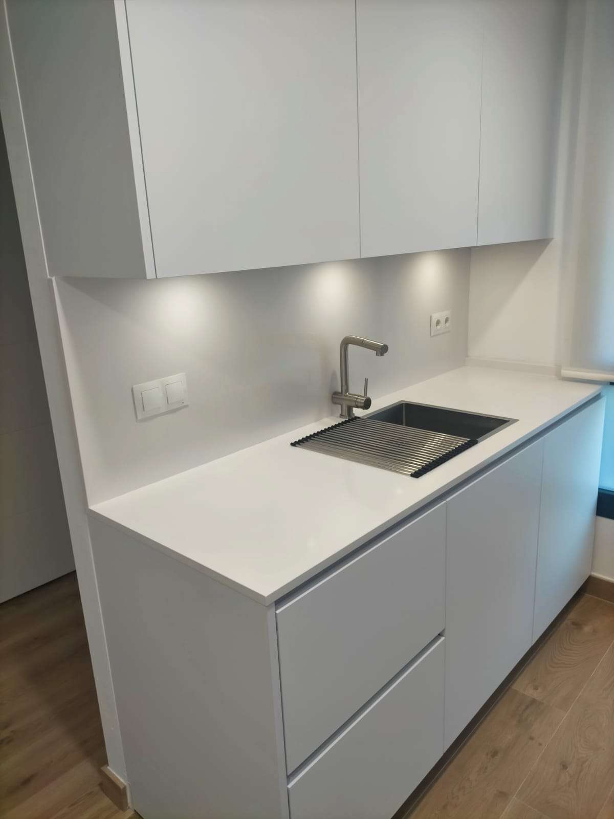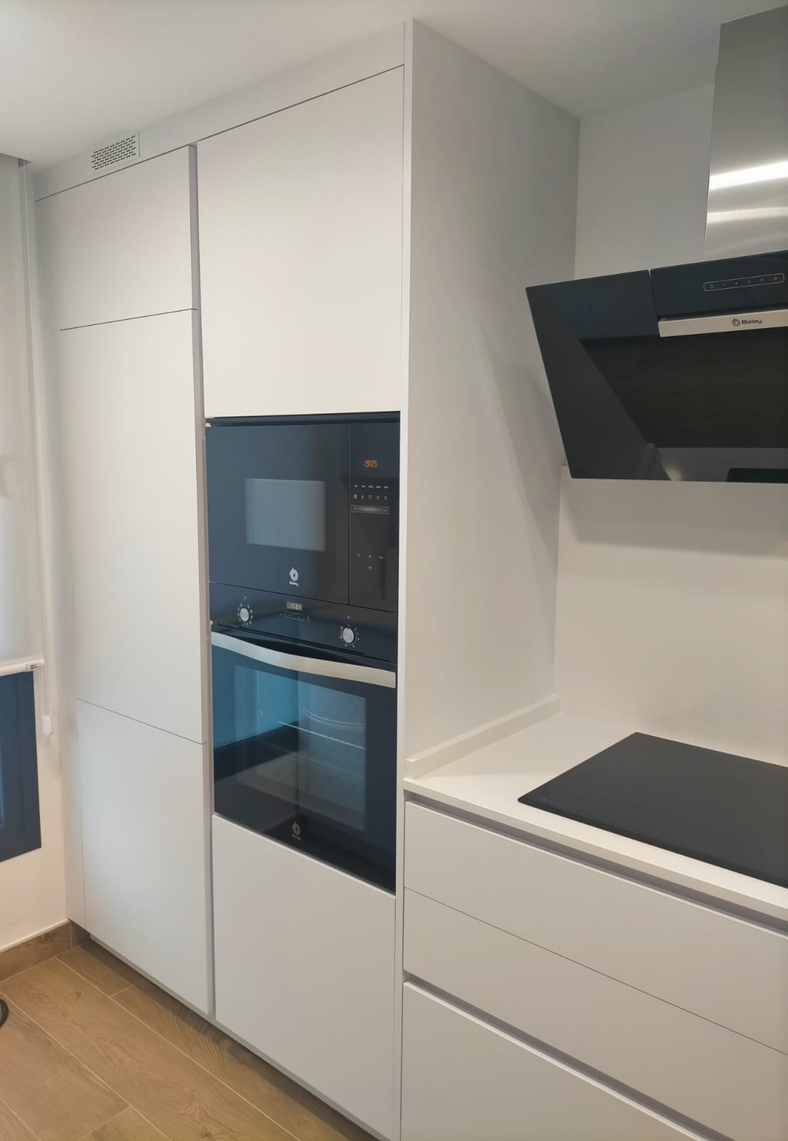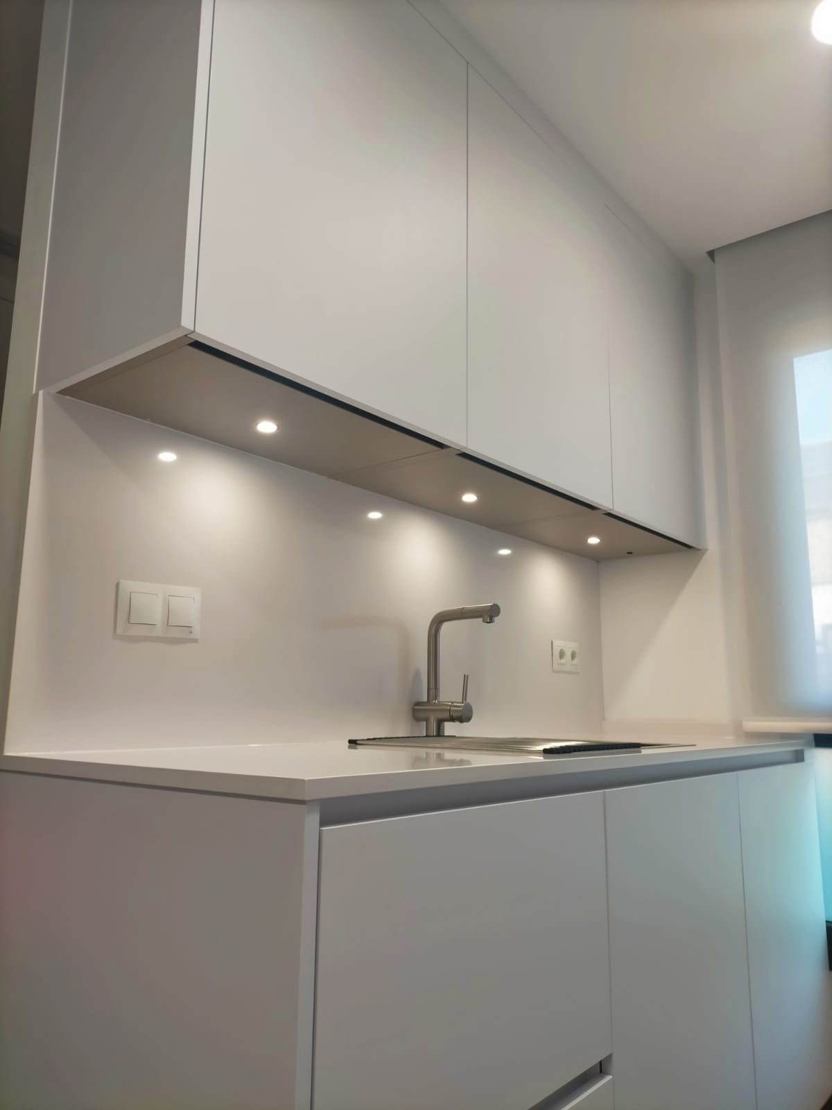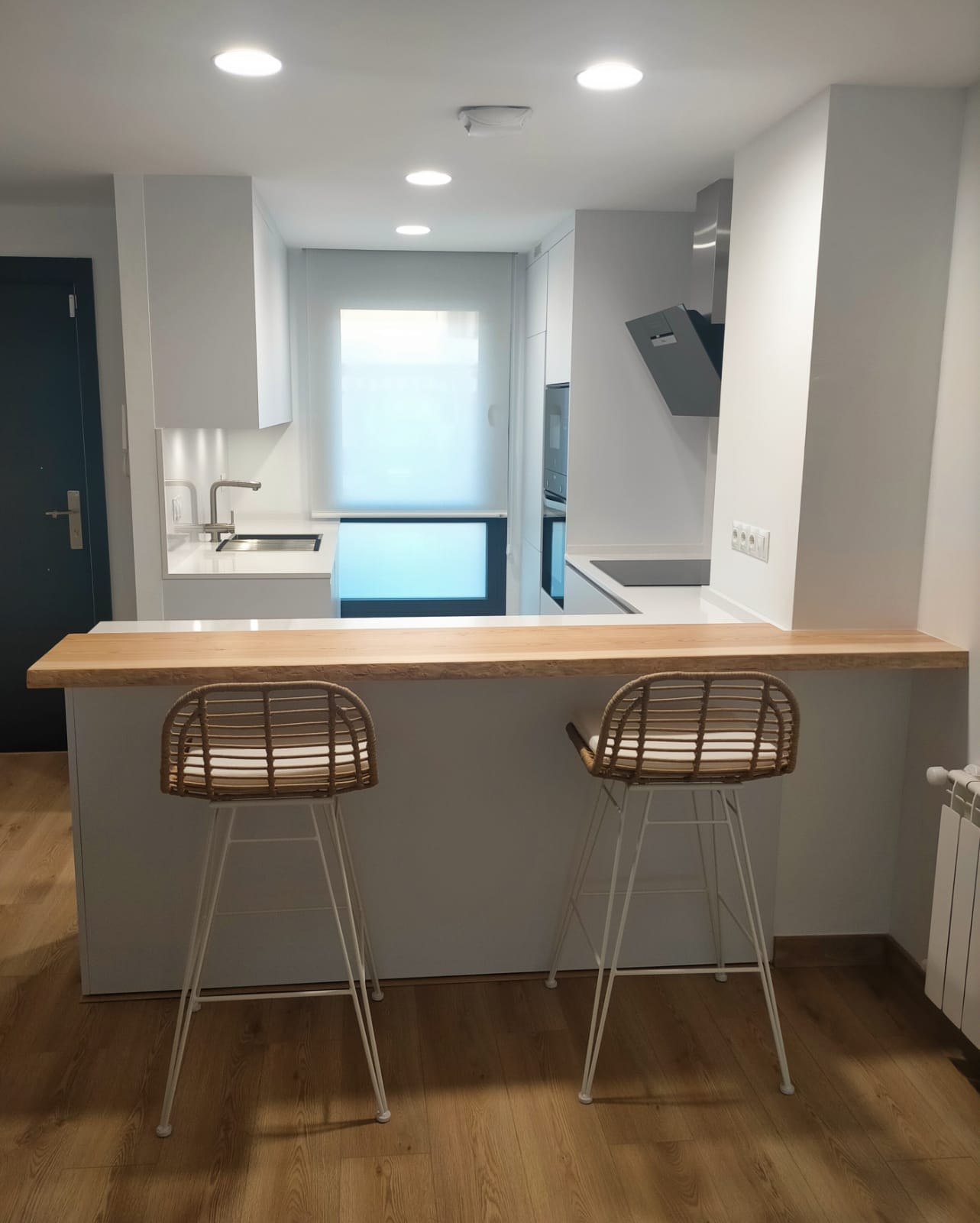 El mobiliario blanco mate aporta una base neutra que amplifica la luz natural, perfecta para cocinas con superficie limitada. La encimera en acabado blanco continuo se integra con el frente, generando una imagen limpia y elegante. El contraste lo pone la barra desayunador en madera natural, que rompe con suavidad la uniformidad del blanco y aporta calidez al conjunto.