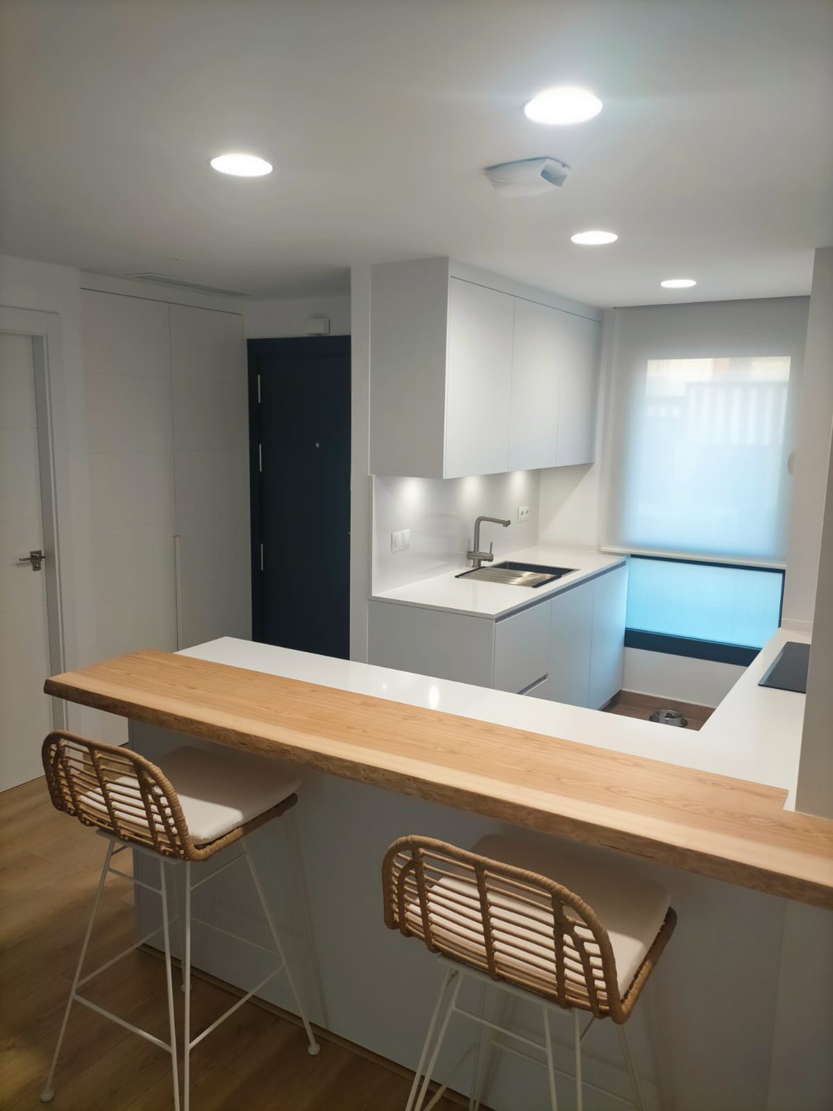 Esta cocina abierta está diseñada para maximizar el espacio sin renunciar al estilo ni a la comodidad. Ideal para quienes buscan una reforma inteligente, que aporte funcionalidad y una estética limpia con sensación de amplitud.