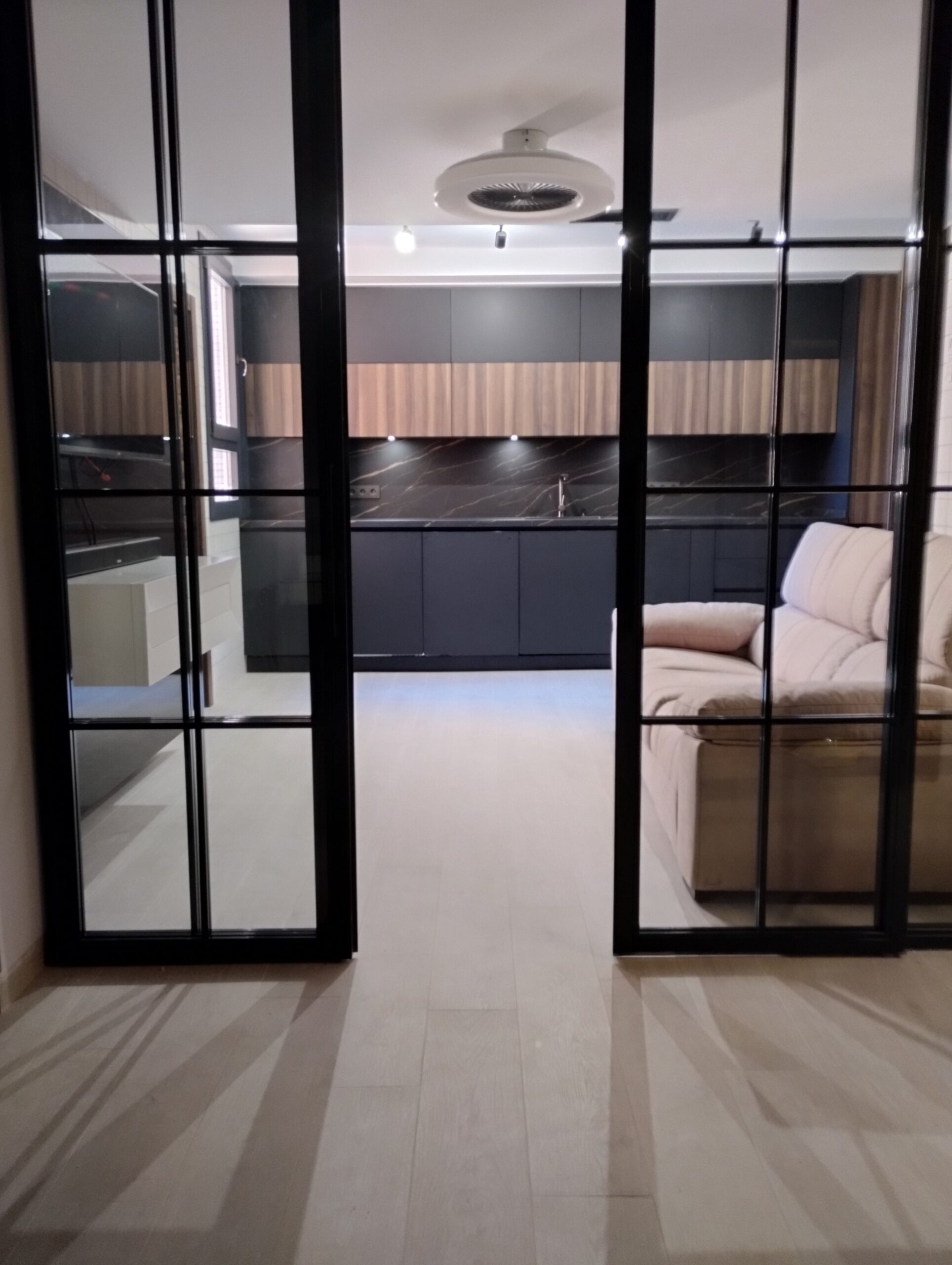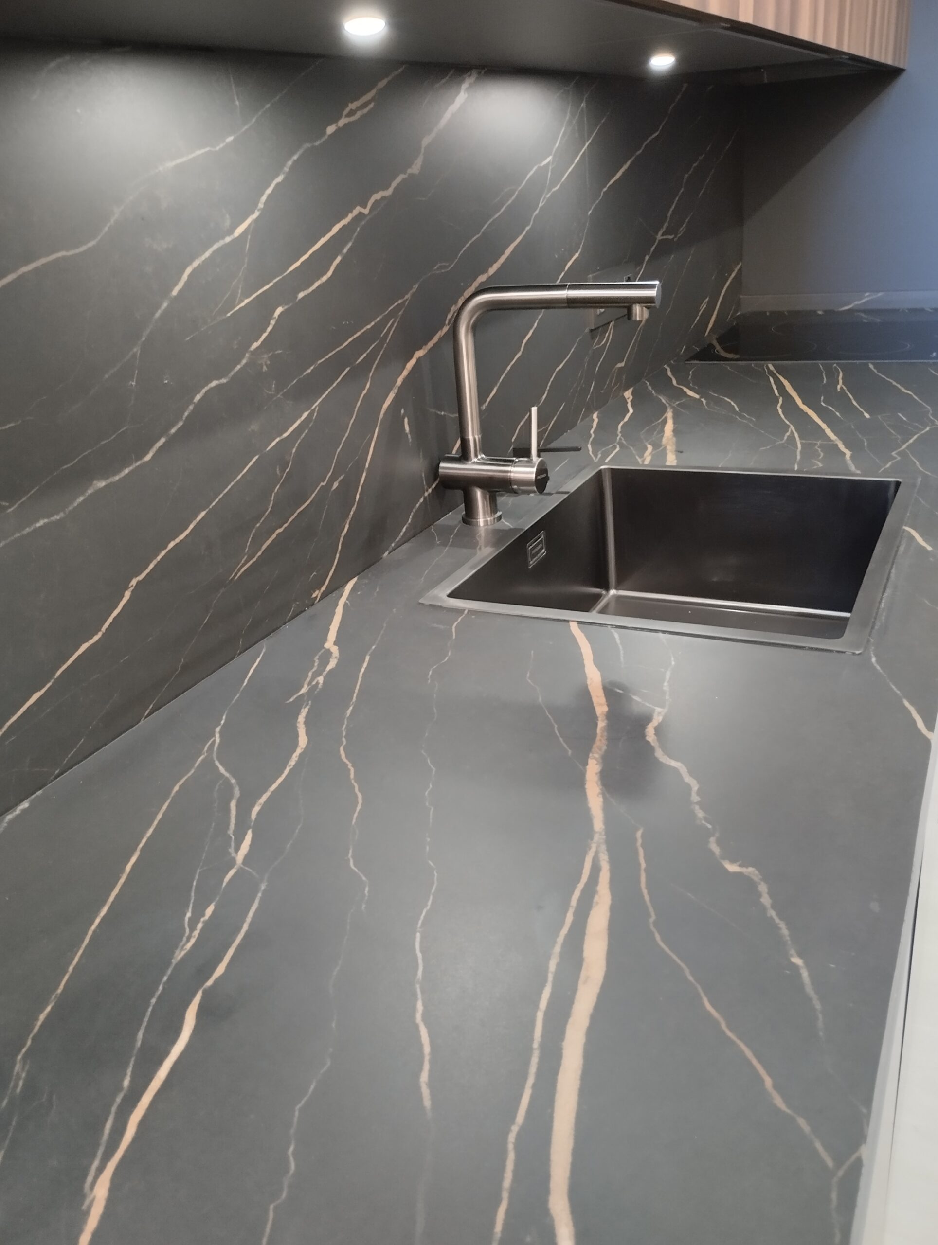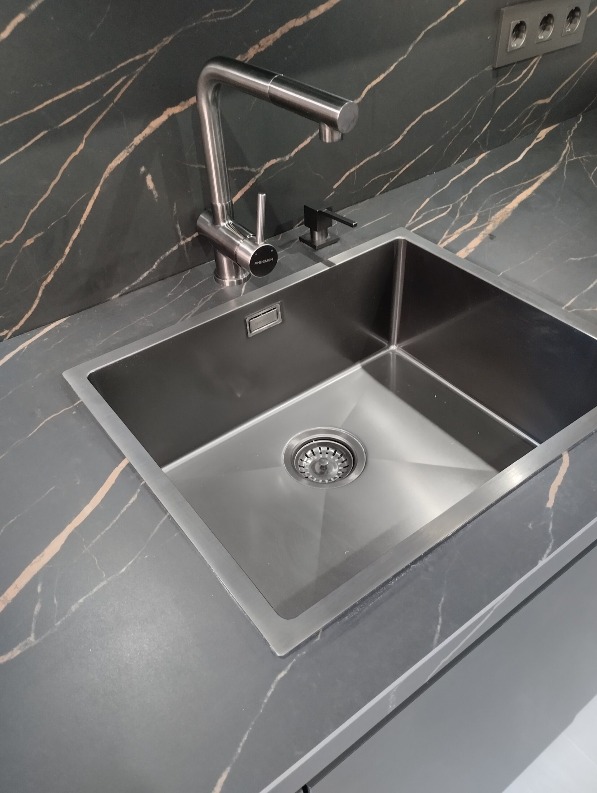La encimera porcelánica negra con vetas doradas añade dinamismo al conjunto y refuerza la sensación de lujo. Los electrodomésticos en negro y el fregadero antracita mantienen la coherencia estética, mientras que el sistema de apertura elevable en los muebles altos aporta comodidad y ligereza visual. Un diseño pensado para quienes buscan una cocina sofisticada y práctica a partes iguales.