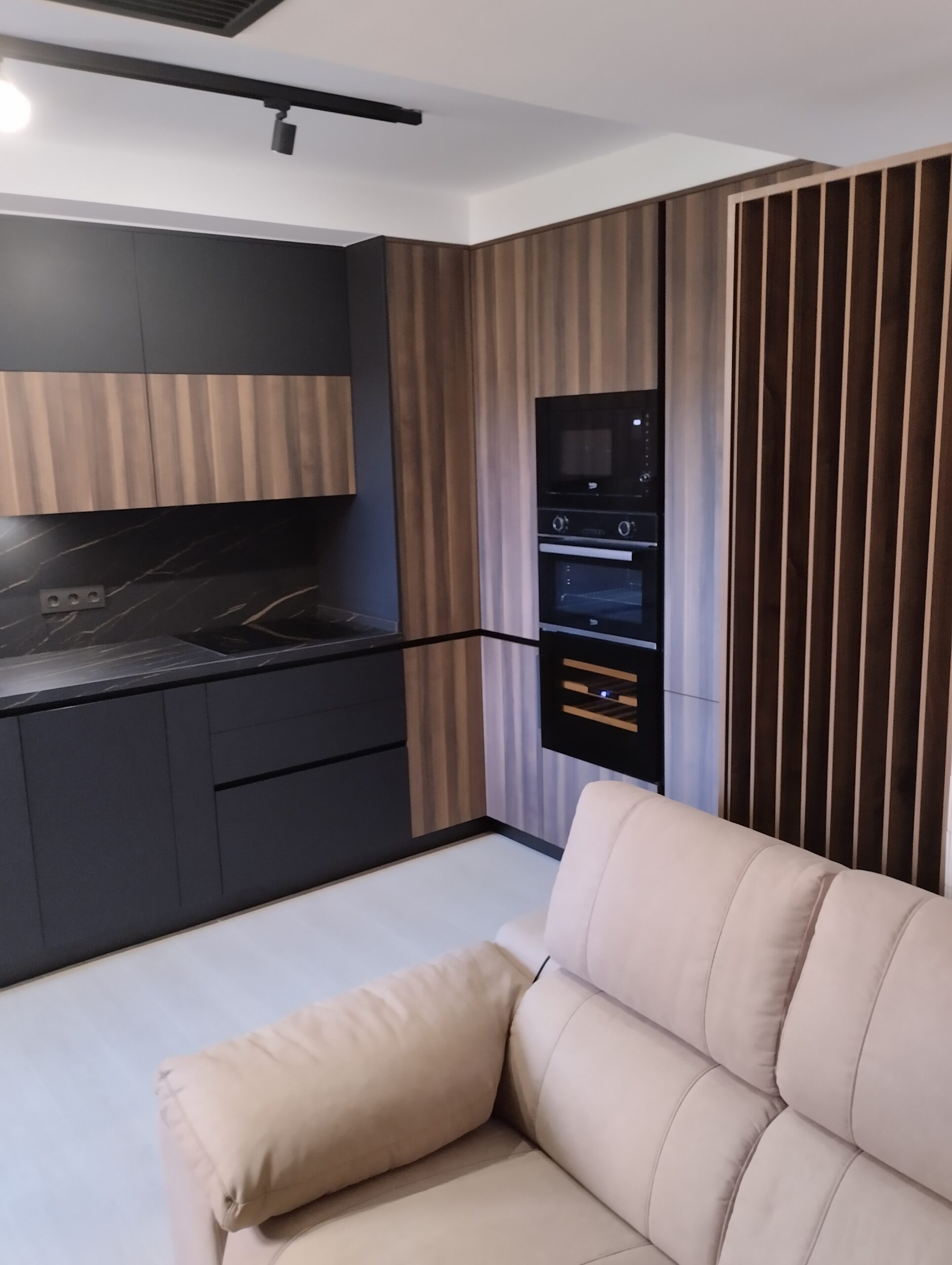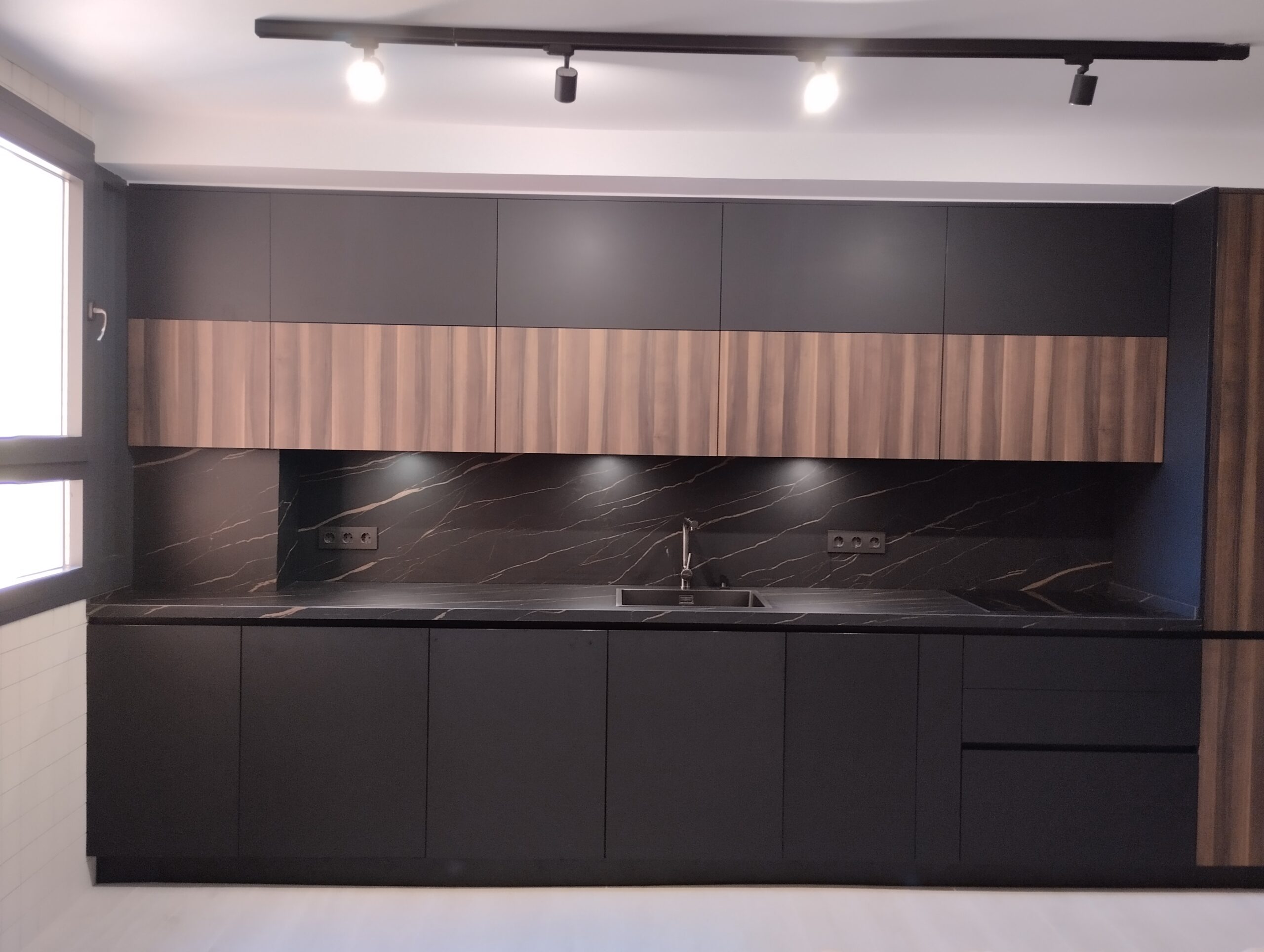 Esta cocina combina dos acabados de fuerte personalidad: el negro mate del mobiliario inferior y el cálido nogal de los muebles altos y columnas. El resultado es un ambiente elegante, moderno y con mucha presencia.