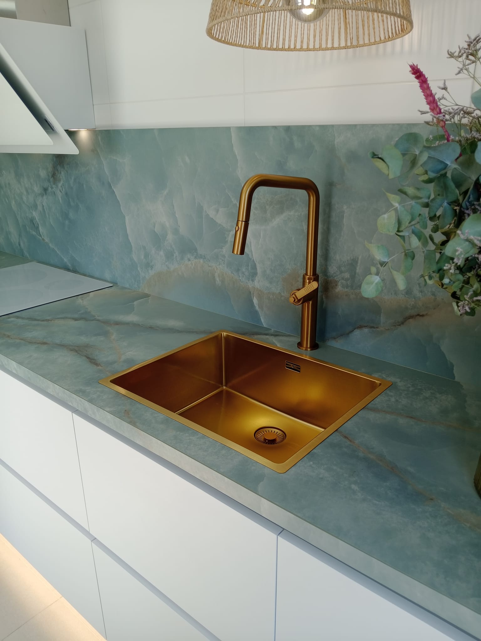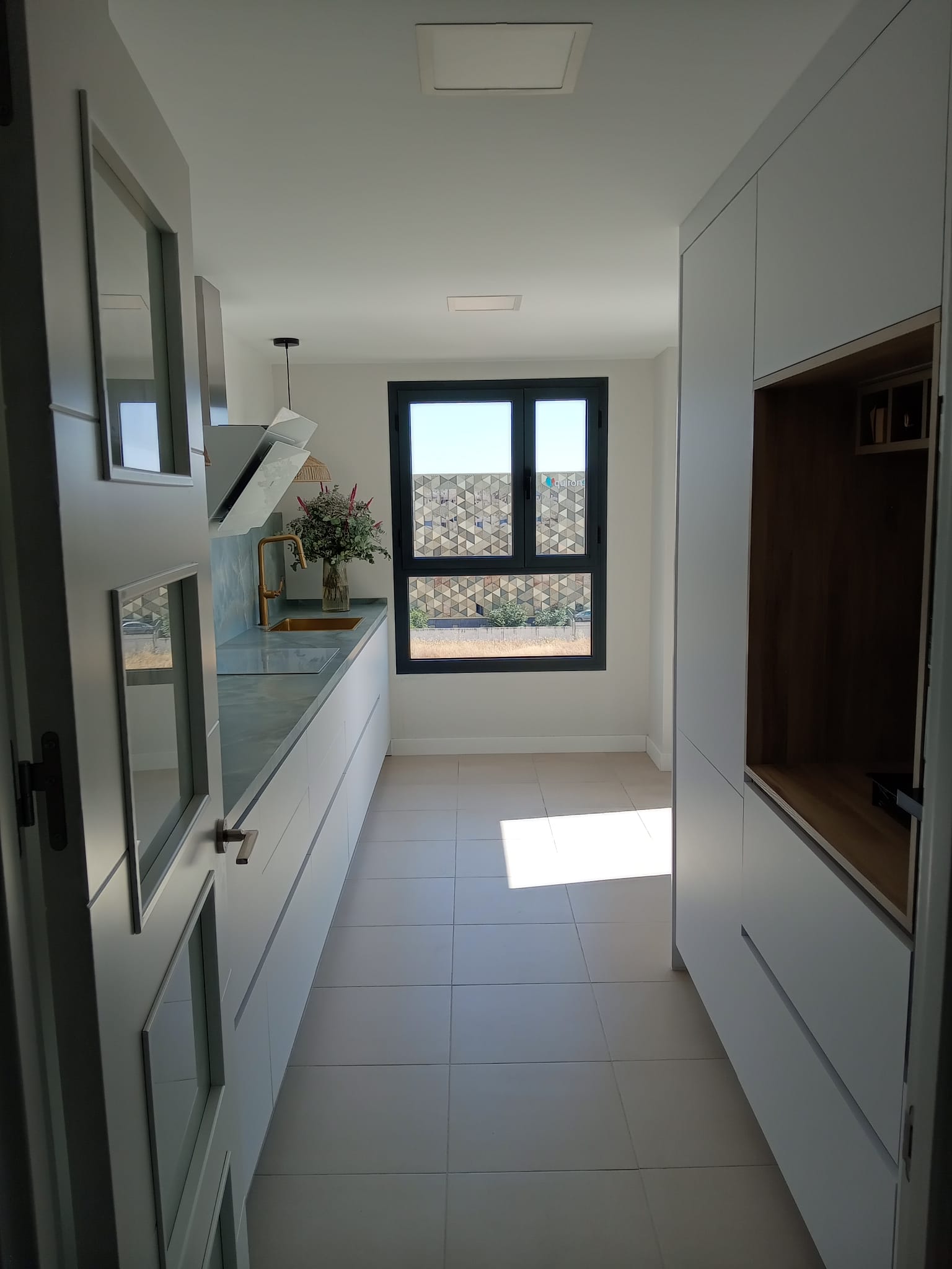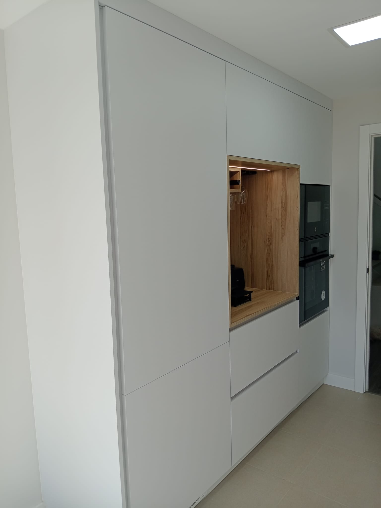 En esta cocina abierta al salón, el equilibrio entre materiales crea un espacio cálido, moderno y funcional. El mobiliario en acabado antihuellas verde oscuro aporta sobriedad y elegancia, mientras que la madera de nogal en columnas y estanterías abiertas da el toque acogedor. La encimera de cuarzo blanco con vetas aporta luminosidad y sofisticación.