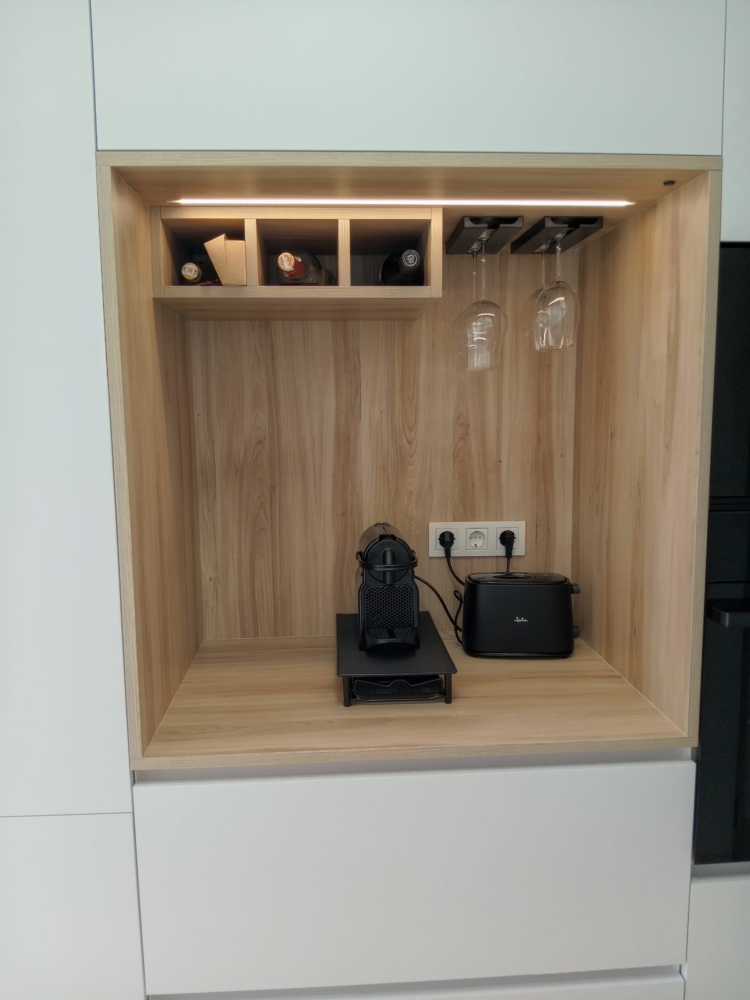 La isla central, con barra de madera natural elevada, permite compartir momentos sin renunciar al confort. Una distribución lineal con gran capacidad de almacenaje, iluminación decorativa sobre la zona de barra y electrodomésticos integrados completan un espacio pensado para disfrutar cada día.