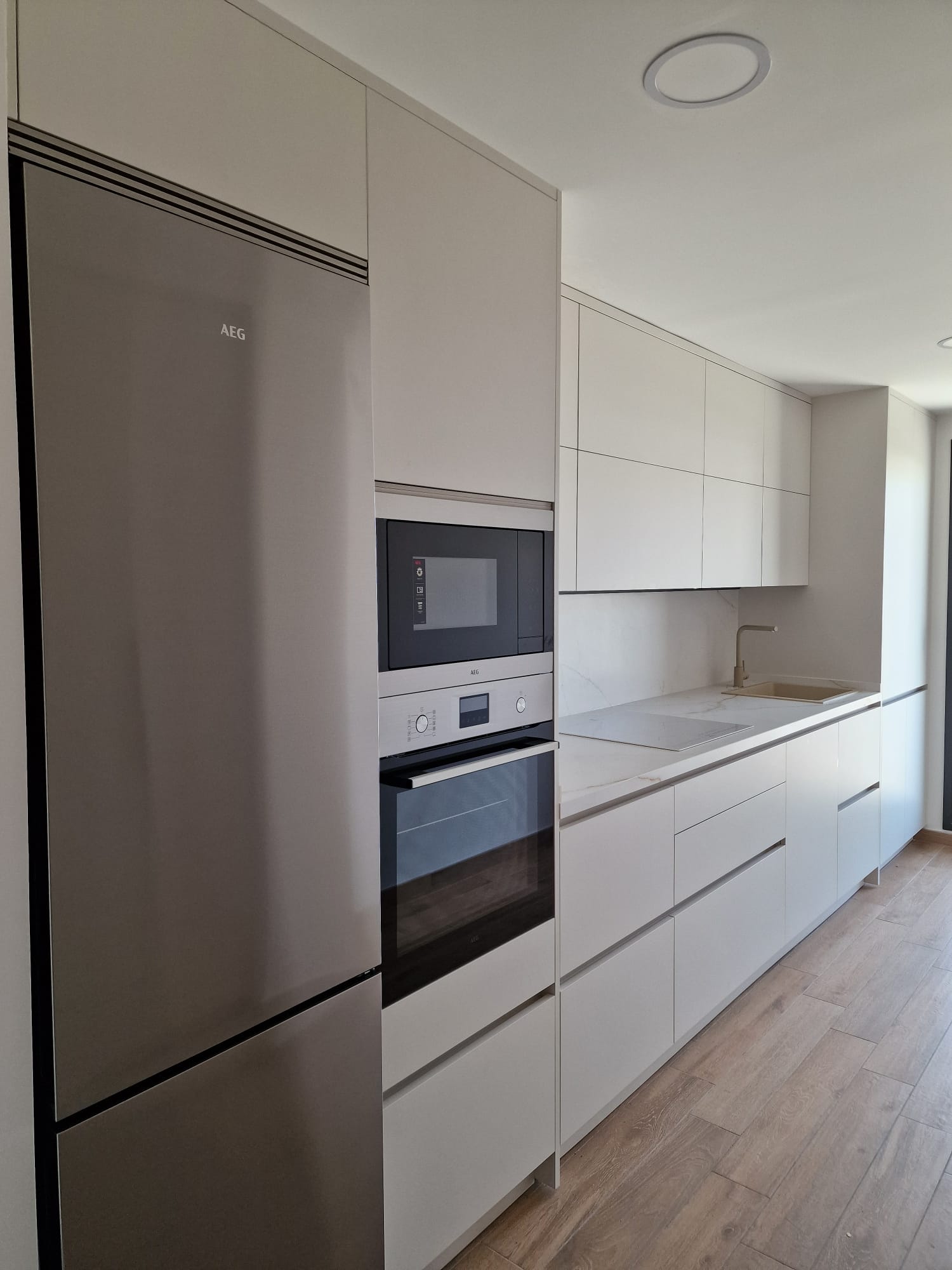 En este proyecto hemos diseñado una cocina paralela que combina estética minimalista y funcionalidad absoluta. En un mismo frente se ubican la zona de cocción, fregadero y electrodomésticos integrados, logrando una distribución ordenada y eficiente.