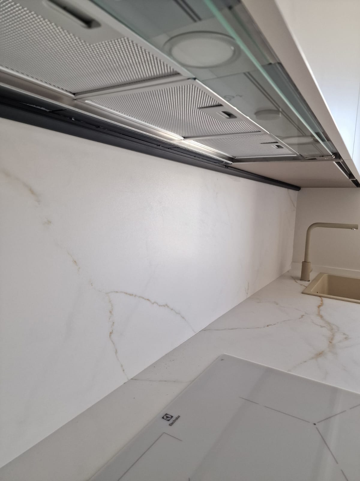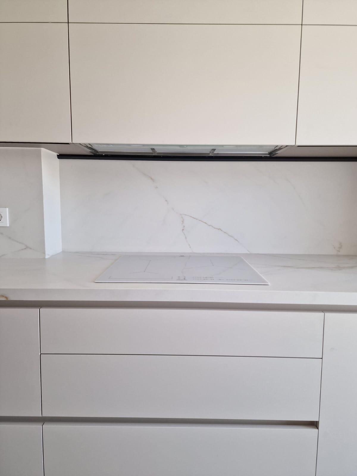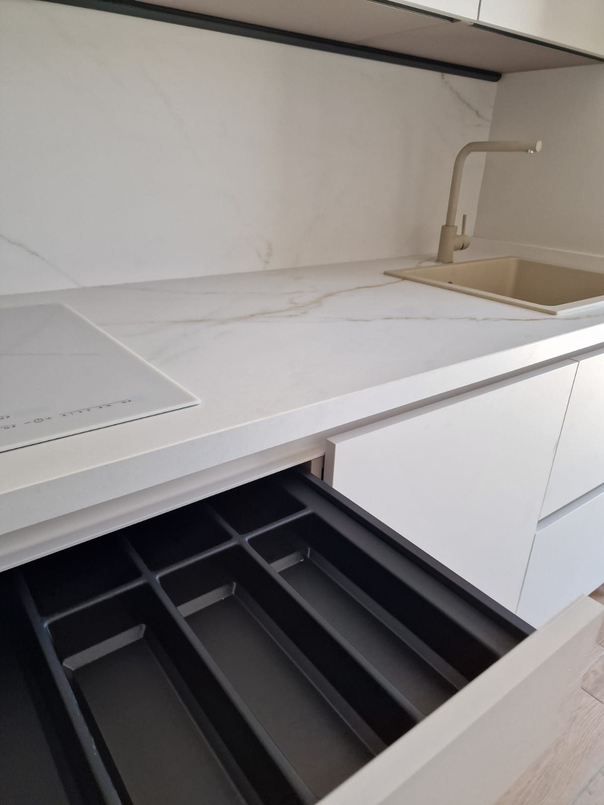 El mobiliario en un único color genera continuidad visual y transmite serenidad, mientras que la encimera porcelánica veteada aporta un toque sofisticado y resistente al uso diario. El fregadero y la grifería, en acabado a juego, se integran de manera armónica con el conjunto.